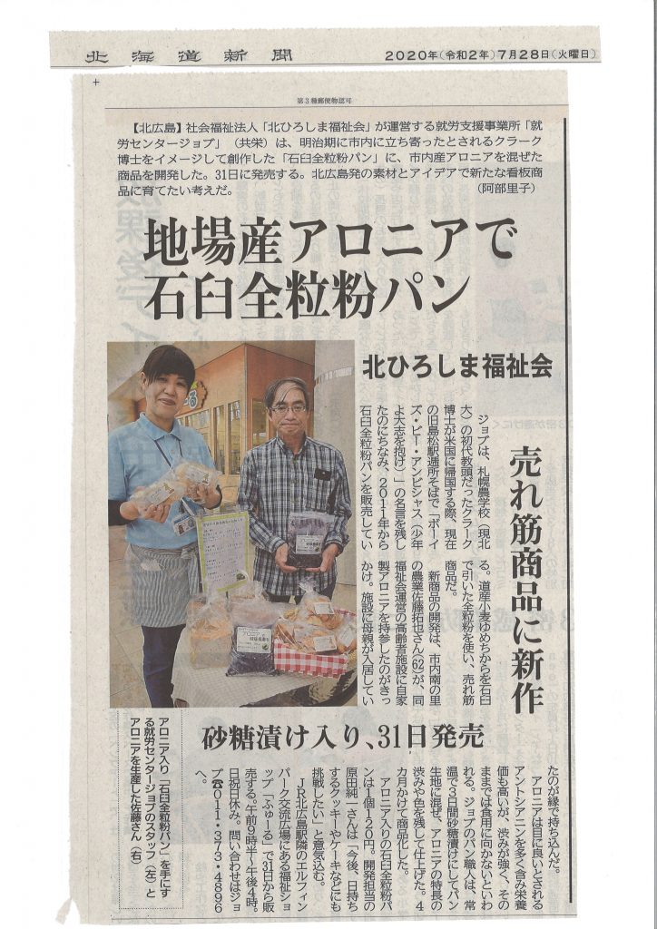 7月28日(火)北海道新聞北広島版に当法人の就労センタージョブが掲載されました。