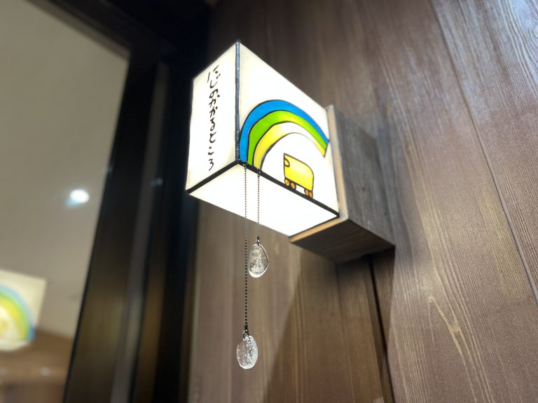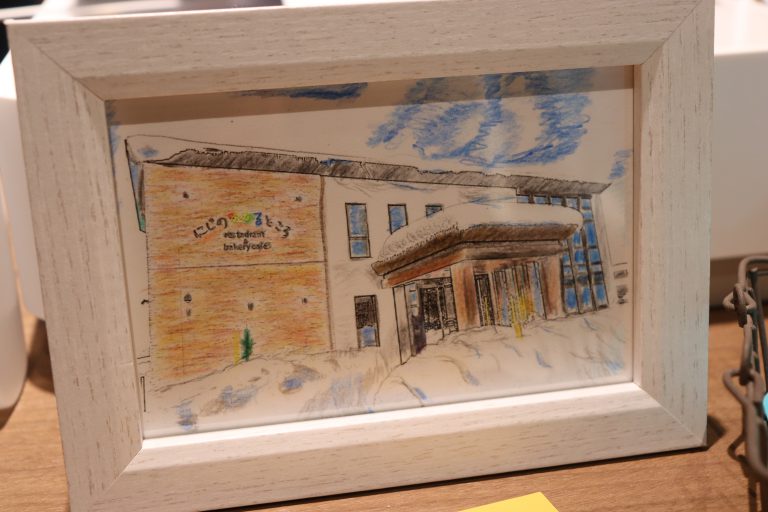 ニーウンペツガラス美術研究所さんの看板がかわいく灯ってお出迎えいたします。