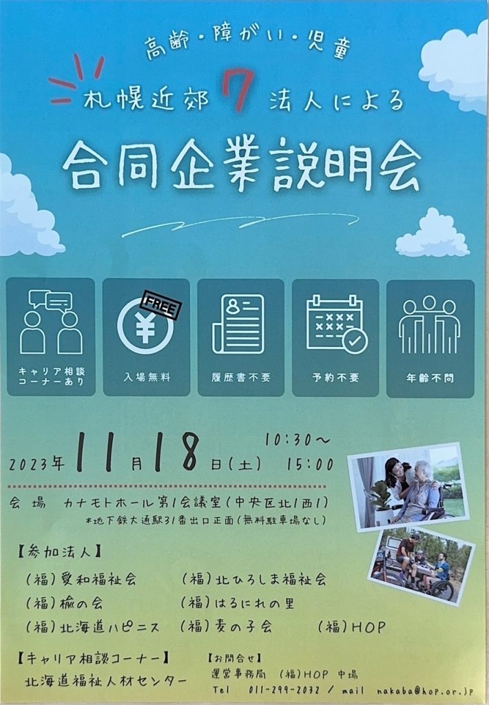 令和5年11月18日(土)に開催される、札幌近郊7法人参加の合同企業説明会に当法人も参加します。