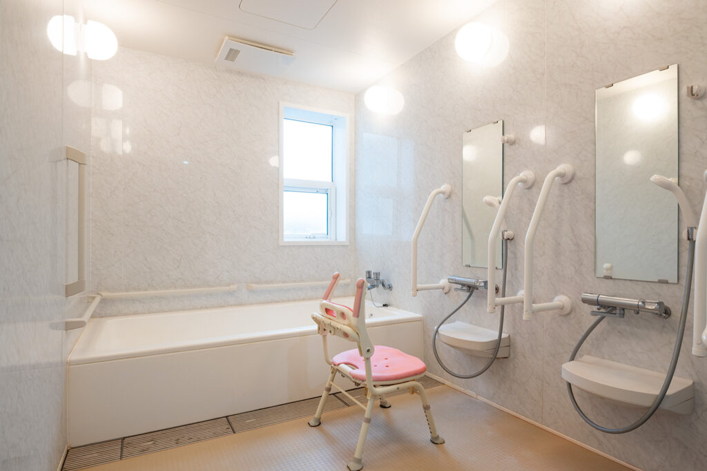 浴室は家庭の雰囲気に近づけてあり、洗い場は二ヶ所設けてあるので、希望があった際に職員のお手伝いもできます。その他、手すりや介助用の椅子などを用意しています。