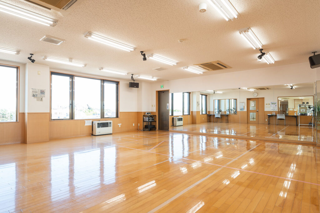 2面が鏡張りのダンススタジオです。音響設備も完備されています。運動に適した服装、靴でご利用下さい。更衣室もあります。