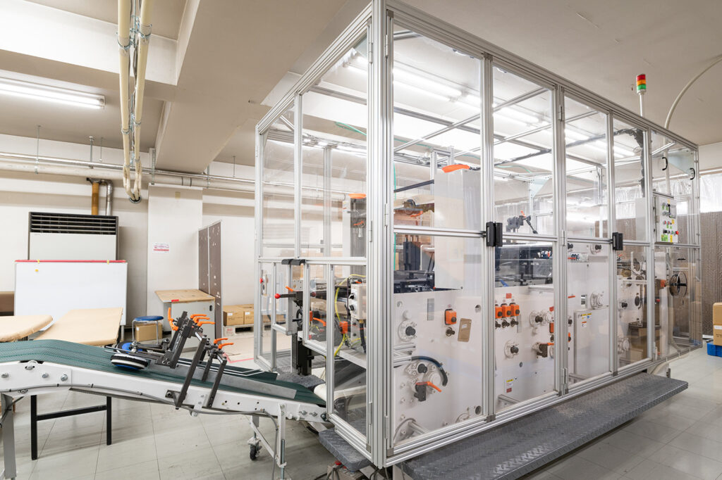 1階の作業として行っている化粧箱の自動組み立てを行う機械です。設定の調整により、大小様々なサイズの箱を自動で折ることが出来ます。速度の調整も可能としており、最大では1分間に約50枚の箱を作成することができます。