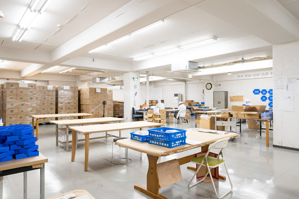 1階作業場では、フロアを2分割して段ボール製品の組み立てと箱折り・整形等の作業を行っています。納期に合わせて作業展開を行い、毎日2~3種類の作業を20名程で作業を展開しています。フロアの半分では自動製函機と呼ばれる自動で箱を組み立てる機械を動かしながら、整形・運搬・完成品詰め等の作業を分担しながら進めており、個人のスキルに合わせて作業提供をしています。段ボール製品の組み立てではその日入荷した材料を次の日に納品できるように材料を分配して作業を展開しています。
