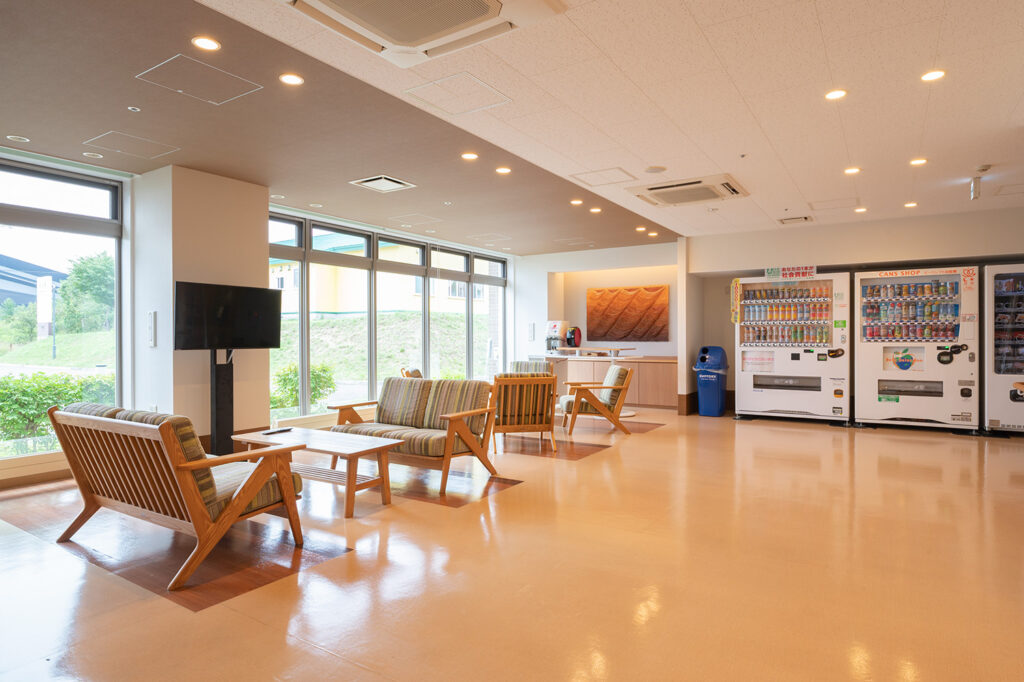 ご家族やお客様、入居者様同士の会話を楽しんでいただけるスペースです。自動販売機も設置されています。